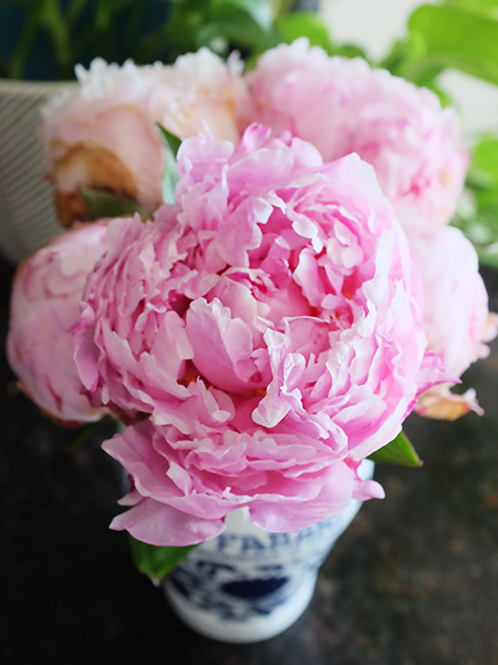 白、黒、茶色で統一している我が家も、今日は華やか。朝起きたら、昨日ころころのつぼみの状態で買って来たピオニーが開きかけていました。